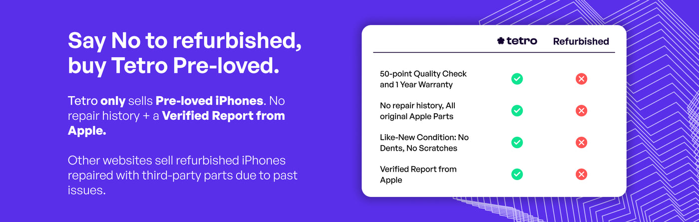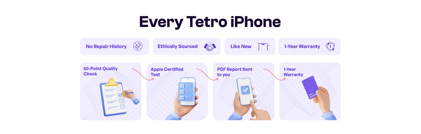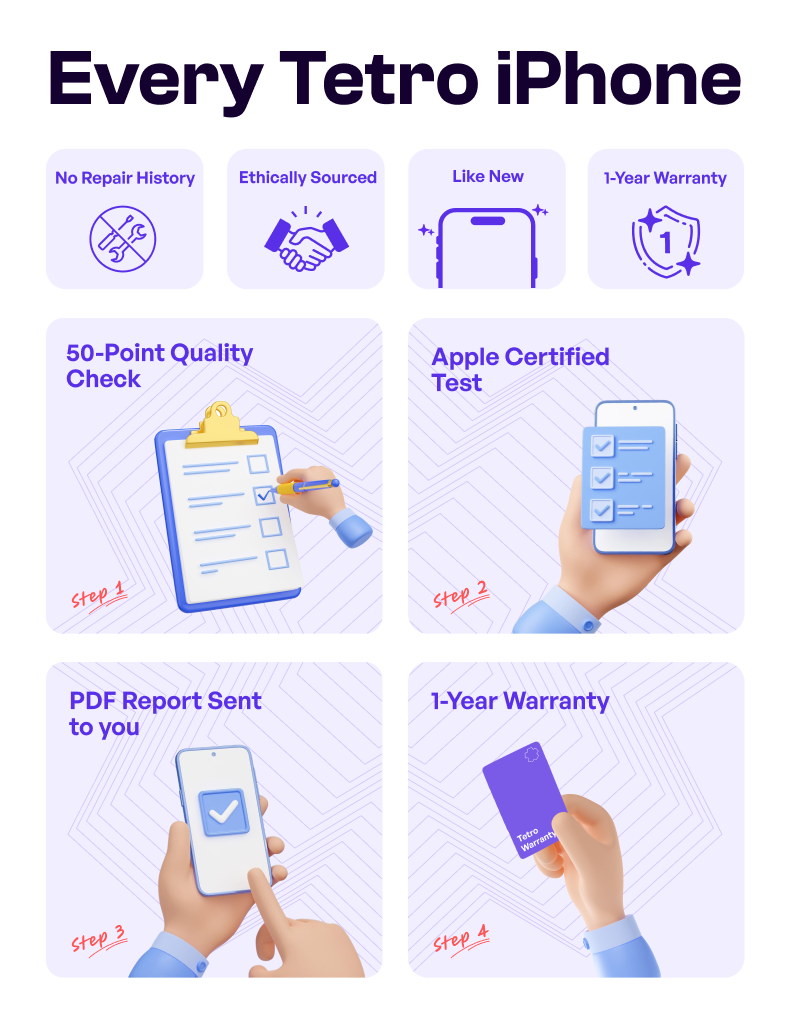 At Tetro, we are committed to delivering quality and peace of mind with every purchase. That's why we offer a comprehensive warranty on our Pre-Loved iPhones.