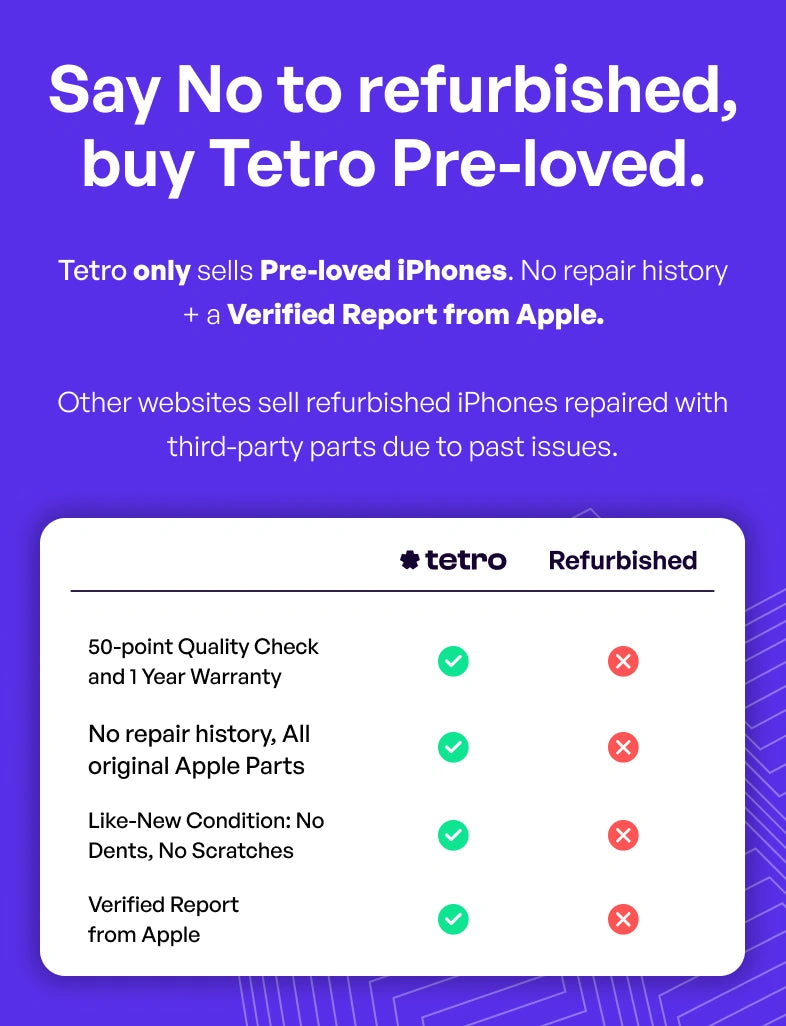 But each Tetro iPhone is pre-loved and taken great care of, by somebody like you. All Tetro iPhones are in perfect mint condition — with no repair history, no scratches or dents and passing all 50 checkpoints. Tetro sells only the highest grade of iPhones, rejecting all other grades of iPhones.